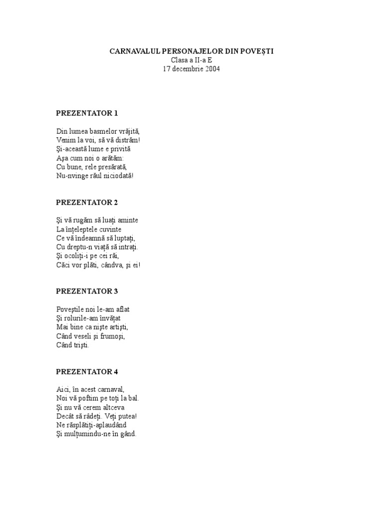 Cântece pentru carnavalul personajelor din povești texte publicat pe 8 iunie 2011 de dorel puchea biserica harul lehliu gară în pregătirea serbării de sfârșit de an școlar am căutat asiduu negative și texte pentru cântece. Carnavalu personajelor din povesti 1 duration. Bine ati venit dragi invitati. Barascu leon catalin 3 847 views.