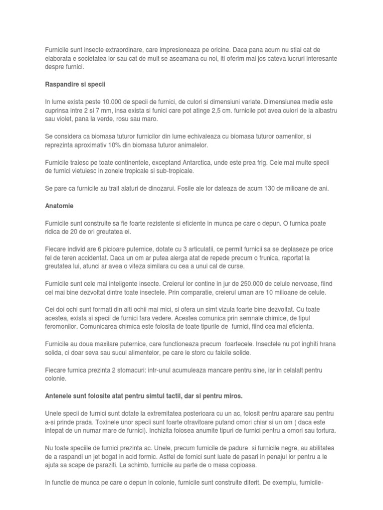 Dovada faptul ca furnicile s au inmultit fiind cea mai numeroasa populatie de pe planeta iar din dinozauri n au mai ramas decat vreo doua schelete si niste povesti. Furnica este una dintre cele mai puternice creaturi din lume în raport cu dimensiunea sa. Am tema la romana d ddau fund0i x x. Tot respectul pentru vietatile astea mici cat o virgula dar atat de tenace de bine organizate si de constiincioase.